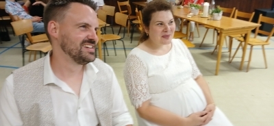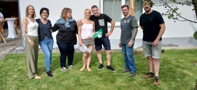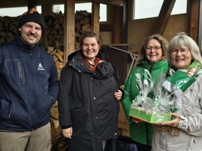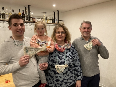 Die glücklichen Eltern, mit Ulrikle und Manuela, die unser Geschenk übergeben