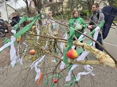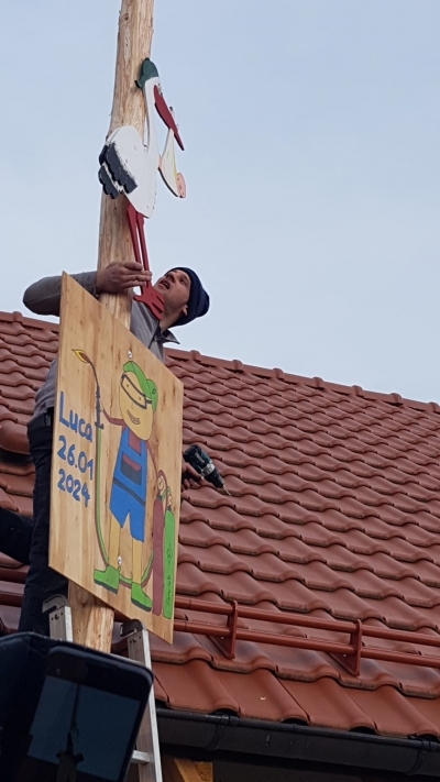Der Baum für Louis steht. Es fehlen noch das Schild und der Storch