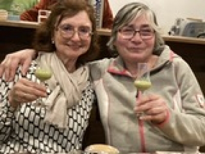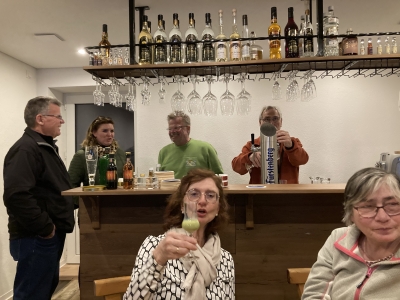 Die neugewordene Oma Regina stösst Fanclublike mit grünem Getränk an.