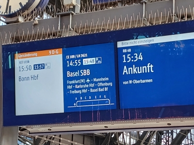 Zu allem Übel gingen auch die Uhren der Bahn unterschiedlich? 2 ausgefallene ICE, zusätzliche Umstiege, und letztendlich war der letzte Regionalzug Richtung Säckingen am Rückreisetag der erste pünktlich abfahrende Zug des Tages, 3 Minuten bevor der eigene ICE in den Bahnhof fuhr. Nach der Rückfahrt mit dem Taxi zum Säckinger Bahnhof, war dieser Regionalzug immer noch nicht in Säckingen angekommen!