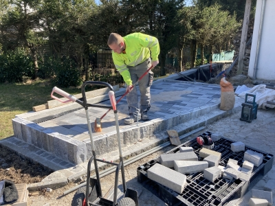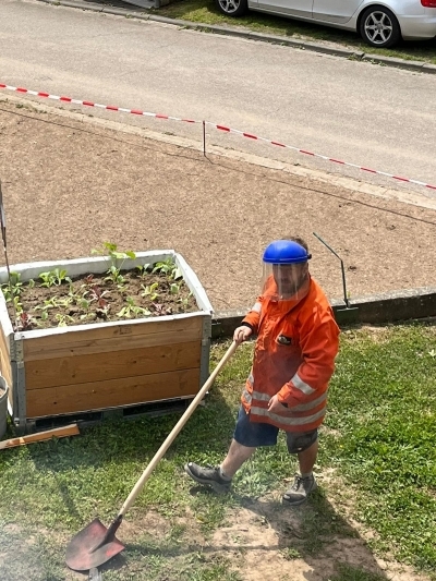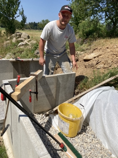 Auch das ist Baustelle: Der frischgebackene Maurermeister Jan-Owe bei der Hinterfüllung einer neuen Stützmauer im heimischen Garten.