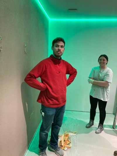 Was hat bauen mit dem Fanclub zu tun. Nathalie und Mari verraten es hier mit der Beleuchtung. Das neue Heim strahlt in grün und weiss!