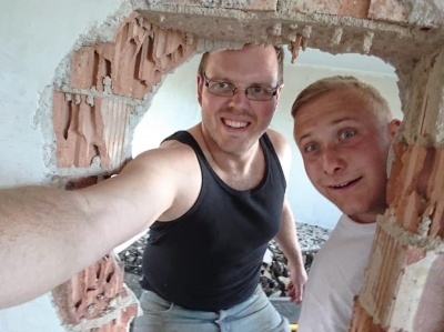 In Harpolingen bauen im Moment wohl alle Jungen? Und haben sichtlich Spass dabei, trotz der Arbeit. Hier Mark und Jan-Owe.