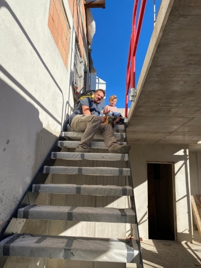 Papa Thorsten und Anton auf der Treppe der neuen Maschinenhalle