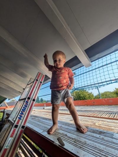 Papa Thorsten und Anton auf der Treppe der neuen Maschinenhalle